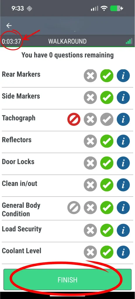 Alongside the timer, the update brings two naming changes that may seem small but carry real operational weight. The button that begins the check has been renamed “Start”, making the point at which the timer kicks in explicit. At the end of the checklist, the button now reads “Finish” rather than a generic confirmation label, clearly marking when the check is complete. Both changes reduce the risk of drivers accidentally submitting incomplete checks or misunderstanding where they are in the process.